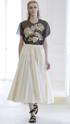 迪奧套裝(Bar Suit)作為迪奧品牌的精髓,成為本季的設計主線而不斷被強調(diào)。如今,設計靈感在原有的基礎上不斷突破,迪奧套裝的標志廓形:沙漏型的外套和超大裙擺,再次被運用到本季設計中,而強烈對比的黑白兩色也成為本季的色彩基調(diào)。
