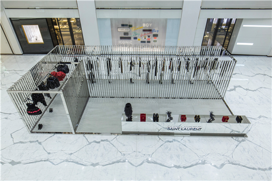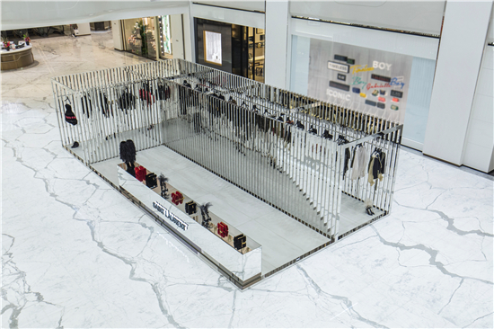 為展現2018夏季系列的主打單品, Saint Laurent運用品牌的現代美學理念, 特別構想限時精品店裝置設計: 打造通透開放空間,運用光線及金屬元素突顯建筑的銳利線條。