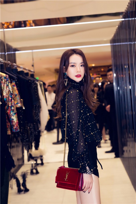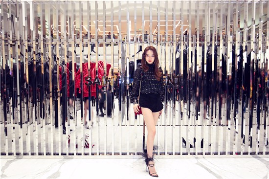 戚薇身著SAINT LAURENT BY ANTHONY VACCARELLO 18 夏季系列雪紡廓形上衣, 麂皮短褲,羽毛裝飾系帶涼鞋,身背 SKP限定款紅色絲絨Sunset包袋
