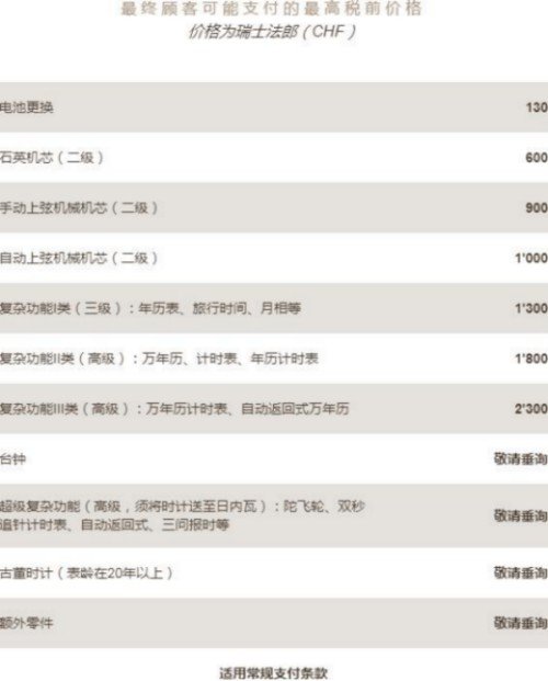 百達(dá)翡麗表保養(yǎng)一次多少錢?其實最低也才折合人民幣一千出頭。百達(dá)翡麗腕表想要的是你所購買的那一款表能夠完美到能當(dāng)傳家寶傳承下去的程度,所以他的保養(yǎng)水準(zhǔn)十分高超,而他家的保養(yǎng)維修費用會低于下表的價格的,而且適用于所有款式的腕表保養(yǎng)維修服務(wù)。