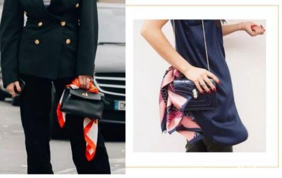 絲巾本來就非常漂亮了,當你想為你的單色的包袋增添一抹亮眼的風姿,你可以選擇將絲巾系于包袋上,或是提手處,或是鎖扣處,總能帶給你驚喜。這樣做能更好的突出你的包袋,新穎別致。