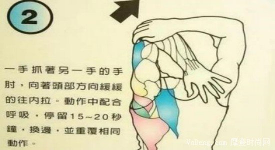 2、第二步就是要使你的手臂彎曲向你的肩部斜后方慢慢拉伸,這組動(dòng)作就能讓你的上臂肌肉與你的兩側(cè)的背部肌肉充分拉伸,在這套動(dòng)作中,你可能會(huì)覺(jué)得上肢酸痛,別擔(dān)心,這是正常的。