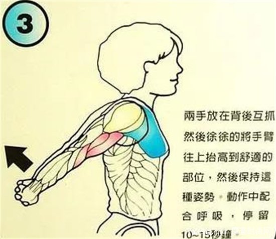 3、第三步是讓你的肩背肌肉得到充分拉伸,把手臂向后拉出并向上緩緩抬起,使你的手臂保持緊繃的狀態(tài),但是當(dāng)你感到不適就需要停止了,不要讓你的手臂擰過(guò)頭了。