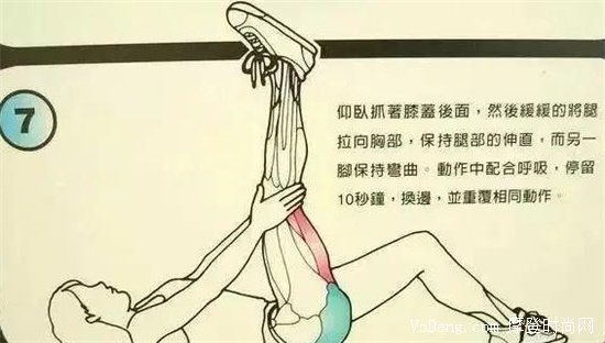 7、第七步要求你躺下來(lái),這一步動(dòng)作可以有效拉升到你的下臀以及大腿后側(cè)的肌肉群組,一定要注意你的氣息的配合,堅(jiān)持就是勝利!