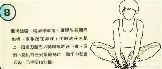 8、第八步很像僧人們打坐時(shí)候用到的姿勢(shì),這個(gè)坐姿恰好能夠幫你拉伸到你全部的腿部?jī)?nèi)側(cè)肌肉,要注意動(dòng)作一定要規(guī)范標(biāo)準(zhǔn),這樣才能達(dá)到更好的拉伸效果。