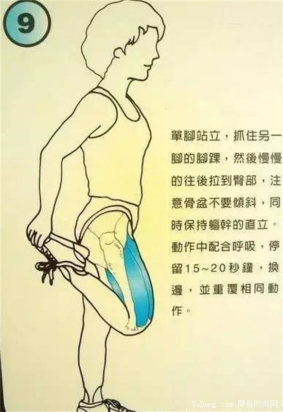 9、第九步需要你單腿站立,注意保持直立,雖然這個(gè)動(dòng)作可能很難保持平衡,必要時(shí)你可以扶一下墻避免摔倒。
