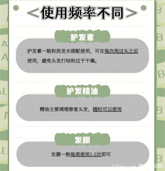 護發素用在你使用了洗發水洗頭之后取適量涂在發梢而不是發根,千萬不要接觸頭皮,否則會讓頭皮越來越油,而且可能對頭皮造成傷害,停留幾分鐘即可,再直接用溫水沖洗干凈;發膜則用于在洗頭后擦除多余水分時,適量涂抹,同樣不能涂在頭皮上,需要包上熱毛巾停留十幾分鐘就行了,之后再沖洗干凈。
