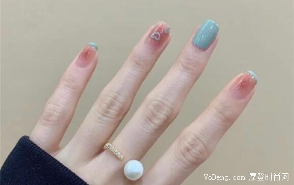 這一款兩個指甲是涂藍色,另外三個指甲非常有心機,涂上漸變冰粉色,再加上一個藍色的愛心,最后在指甲的邊緣位置上一層藍色,乍眼一看還以為是只有邊緣那一點點和愛心。