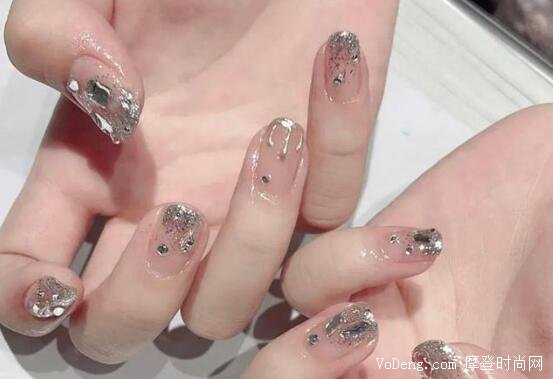 這一款看起來非常高貴,底色是透明的,然后用銀粉漸變的鋪滿,指甲頂端最多,鑲上幾個大小不一的鉆石,這一下簡直就是畫龍點睛,這一款美甲適合御姐風的姐妹們,非常亮眼。