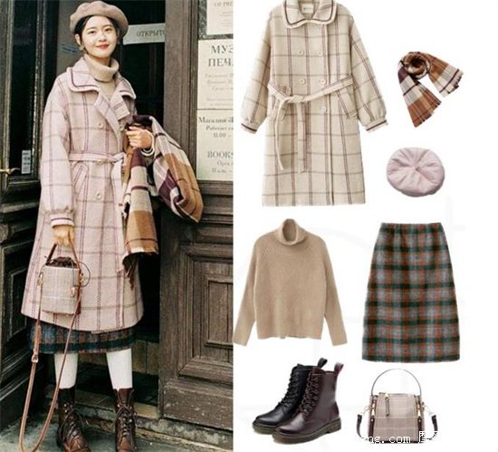 1、呢子大衣搭配學院風格裙
