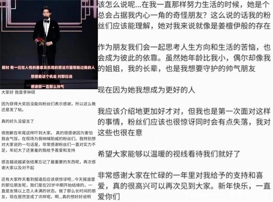 去年12月30日,李鐘碩拿下了MBC演技大賞,在發(fā)表獲獎(jiǎng)感言的時(shí)候,直接表白自己的女友IU并官宣二人戀情,他身披星光,含情脈脈地說(shuō)到:“謝謝你一直很酷,我想告訴你,我喜歡你很久了,我真的很尊重你。”李鐘碩IU正式官宣戀情后,二人又分別發(fā)出長(zhǎng)文像粉絲以及外界做解釋?zhuān)俅位ハ啾戆住?/p>
