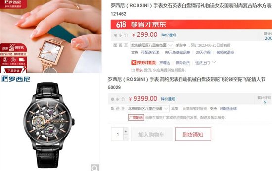 羅西尼家的腕表價格十分低廉,最便宜的手表女石英表121452才售價299元;最貴的自動機(jī)械白盤皮帶陀飛輪50029也不到萬元,才9399元。