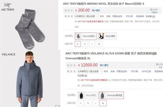 在中國京東官網上,始祖鳥在售的價格最低的產品是它家的MERINO WOOL男女同款襪子,一雙襪子價高200元;而價格最高的是VEILANCE ALTUS DOWN男子商務連帽羽絨服,一件售價12000元。