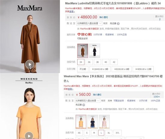 maxmara作為一家高檔服飾品牌,價格自然不菲。最高價的是經典浴袍式羊絨大衣,一件要價48600元,而最低價是棉質混紡純色T恤,售價560元。