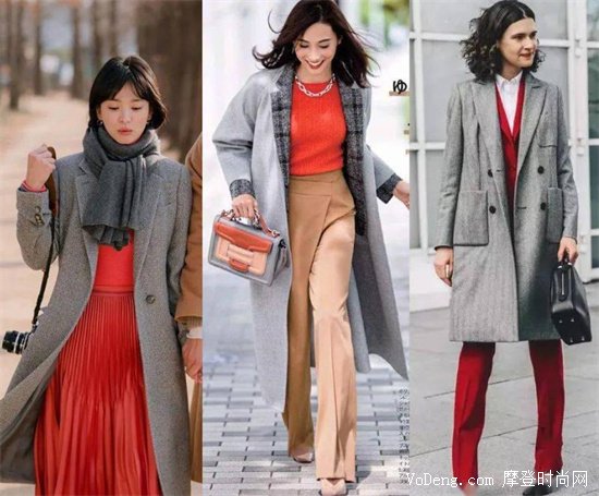 灰色既沒有黑色那樣的嚴(yán)肅穩(wěn)重,也不像白色那般明亮耀眼,屬于是中規(guī)中矩的一個經(jīng)典色。可是它與紅色的搭配一點也不中規(guī)中矩,畢竟灰色的不高飽和的特點,很好的中和了紅色的明度,可以使得你整套穿搭都非常出彩。
