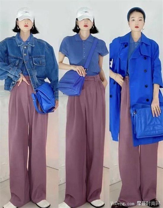 這種克萊因藍與紫色也是很好搭配的,二者的組合有多重感覺。紫色下裝與藍色牛仔服搭配起來,就很有鄰家姐姐的氛圍感;與藍色的POLO衫搭配起來,就有種剛剛打完棒球的錯覺;與藍色大衣搭配起來,你就能化身為街頭潮人,是很亮眼的一抹存在。