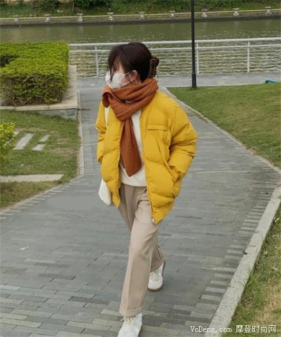 我們也可以嘗試一下黃色大襖與白色運動褲的搭配,這一套穿搭就能顯得你的穿搭整體來說很有層次感,而且也很有生活氣息,減齡又時尚。