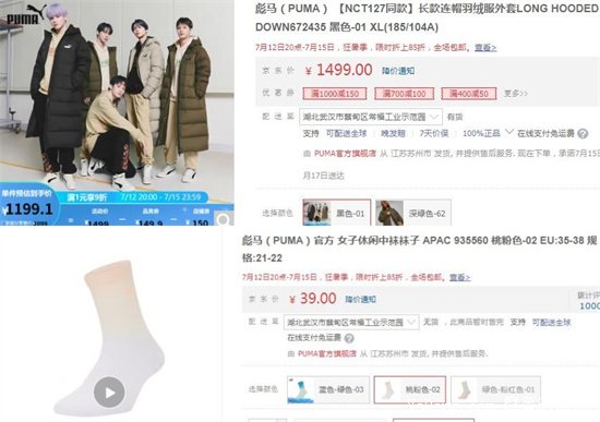 PUMA最貴的產(chǎn)品是長(zhǎng)款連帽羽絨服外套DOWN672435,售價(jià)1499元;而它家最便宜的是女子休閑中襪襪子APAC935560,一雙39元。