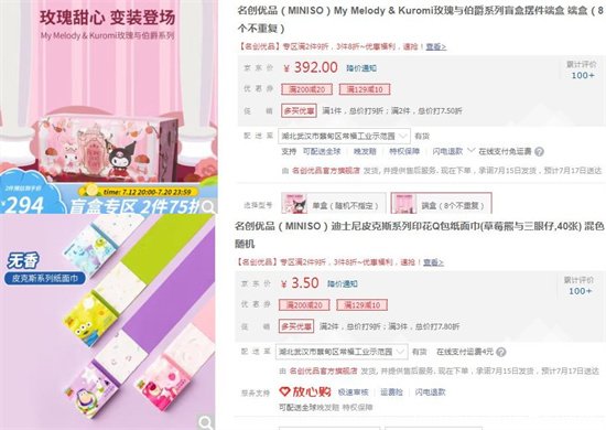 在名創(chuàng)優(yōu)品的眾多產(chǎn)品中,最貴的是My Melody & Kuromi玫瑰與伯爵系列盲盒擺件端盒,一套有8個(gè)盲盒,要392元;而最便宜的是迪士尼皮克斯系列印花Q包紙面巾,一包紙要3.5元。