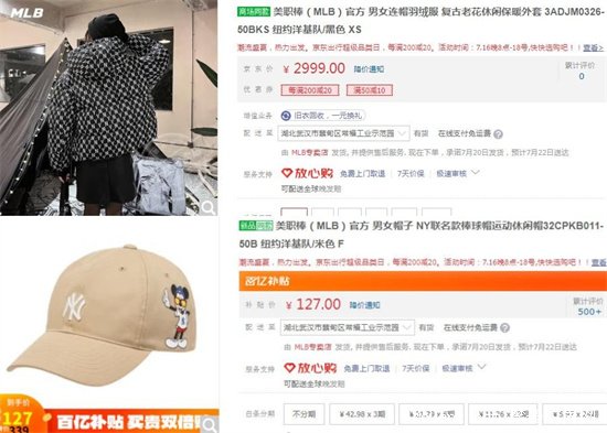 男女連帽羽絨服3ADJM0326-50BKS是mlb家最貴的衣服,要價2999元;而最便宜的是NY聯名款棒球帽運動休閑帽32CPKB011-50B,一頂127元。