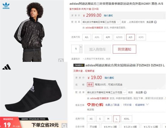 它家最貴的是三葉草男裝春季新款運動夾克外套IA2461,一件2999元;而最便宜的是男女短筒運動襪子DZ9423,一雙19元。