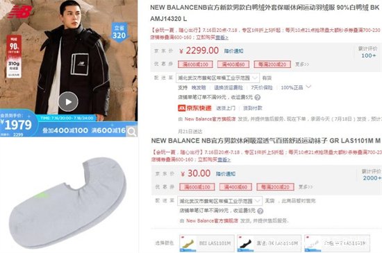 它家最貴的是,新款男款白鴨絨外套保暖休閑運(yùn)動(dòng)羽絨服,售價(jià)2299元;最便宜的是男款休閑吸濕透氣百搭舒適運(yùn)動(dòng)襪子,一雙要價(jià)30元。