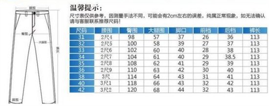 這張詳細的褲子尺碼對照表,不僅涉及到我們熟知的腰圍、臀圍,甚至在大腿圍、腳口、前后襠、褲長上面都有要求,我們購買褲子的時候,可以參考此表格。