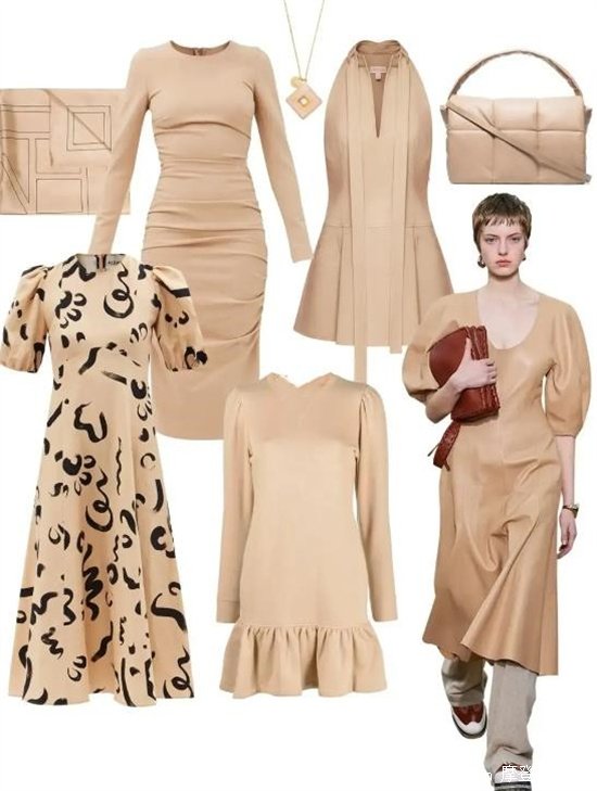 咖色與杏色的組合,就很容易讓人想起摩卡咖啡或者是有夾心的太妃糖,是非常適合秋冬的一組搭配。