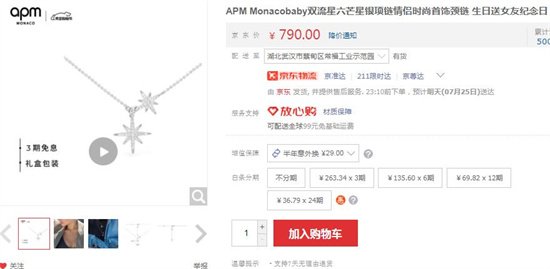 它家最貴的產品是,流星雙層項鏈和不對稱流星耳釘時尚套裝,一套是2950元;而它家價格最低的是蝴蝶銀耳釘女,一件530元。