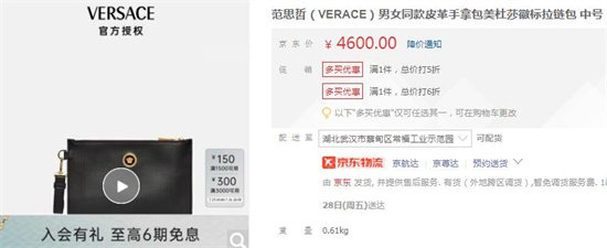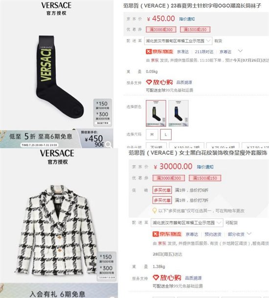 在京東的官方旗艦店里,范思哲最便宜的是23春夏男士針織字母OGO潮流長筒襪子,一雙就要450元;而最貴的女士黑白花紋裝飾收身顯瘦外套服飾,價格更是高達30000元。