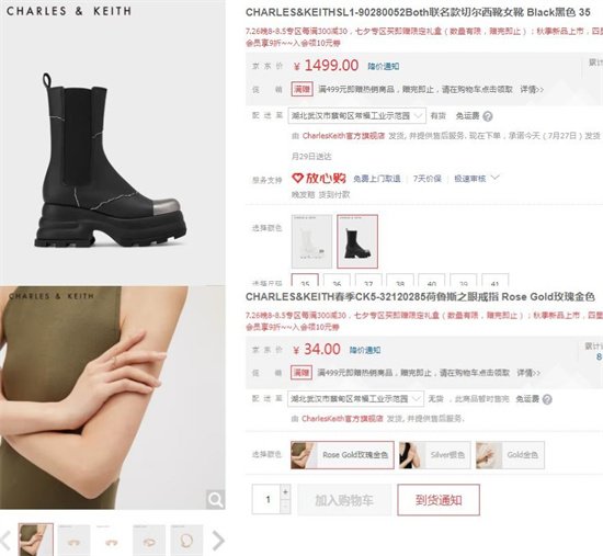 Charles & Keith家最貴的是Both聯名款切爾西靴女靴,一雙要1499元;而最便宜的是荷魯斯之眼戒指,一個要34元。