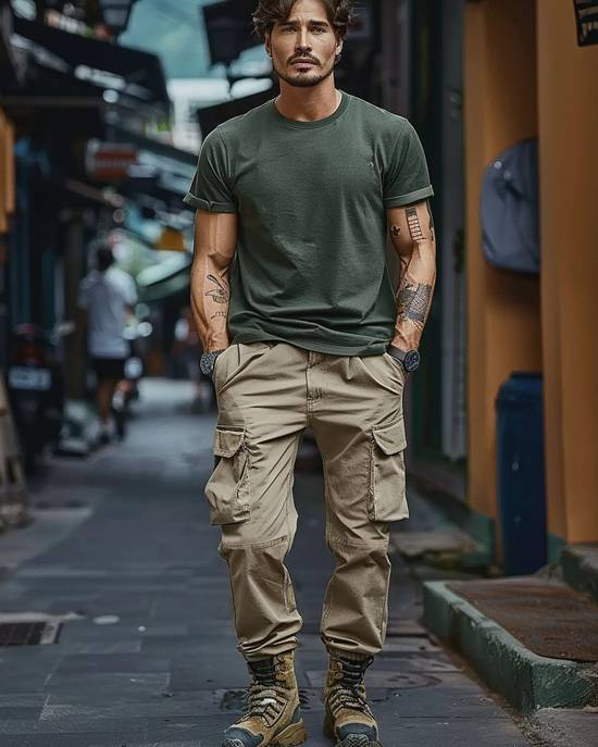要是想顯瘦顯高,黑色神褲必須出場。深藍短袖配黑色西褲有種冷都男的精英感,換成破洞牛仔褲立刻變街頭潮人。記得選九分長度露點腳踝,視覺上直接拔高5公分,微胖星人親測有效!